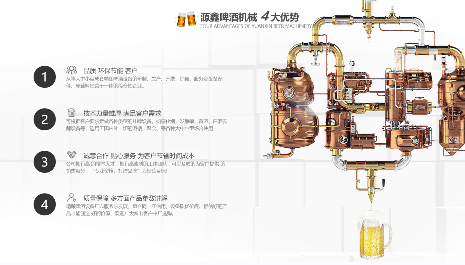 南陽市源鑫啤酒機械設備有限公司位于歷史文化名城一-南陽,從事大中小型成套啤酒、白酒自釀設備的研制、生產(chǎn)、開發(fā)、銷售、服務及設備配件、原輔料經(jīng)營于一體的綜合性企業(yè)。公司可根據(jù)客戶要求定做各種類型的扎啤設備,如糖化鍋,發(fā)酵罐,黃酒、白酒發(fā)酵設備等,適用于國內外一切的酒樓、餐廳、家庭.聚會、酒吧等各種大、中、小型場合使用。公司擁有技術人才,擁有高素質的工作團隊,可以及時的為客戶提供**的銷售服務。公司以“專業(yè)資格,打造品牌”為經(jīng)營目標,“卓越質量,信賴價格”為經(jīng)營宗旨,以質量求生存,以服務求發(fā)展,重合同、守信用,設備質優(yōu)價廉。相信好的產(chǎn)品才能創(chuàng)造 好的價值,歡迎廣大新老客戶來廠選購。...
